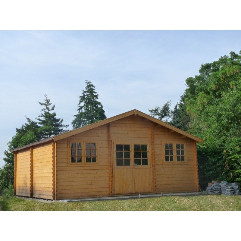 Splendide pavillon de jardin avec une galerie et un toit à deux pans. Idéal pour un grand stockage, ou pour y créer un endroit agréable grâce à sa taille et à la luminosité qu'apportent les fenêtres. Nous utilisons ici le sapin blanc du Nord.