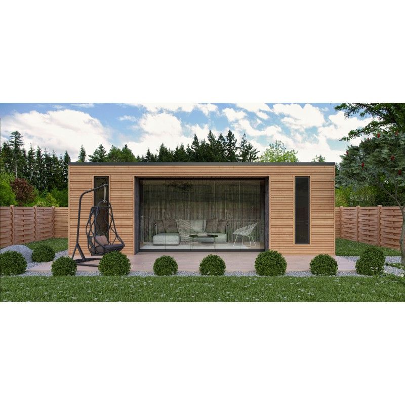 Pavillon extérieur moderne avec son ossature bois. L'extérieur est recouvert d'un placage en bois thermowood de haute qualité de 26 mm d'épaisseur, ainsi que de fenêtres et d'une porte vitrée coulissante. L''intérieur est recouvert d'authentique Barnwood. Ne nécéssite pas d'entretien.