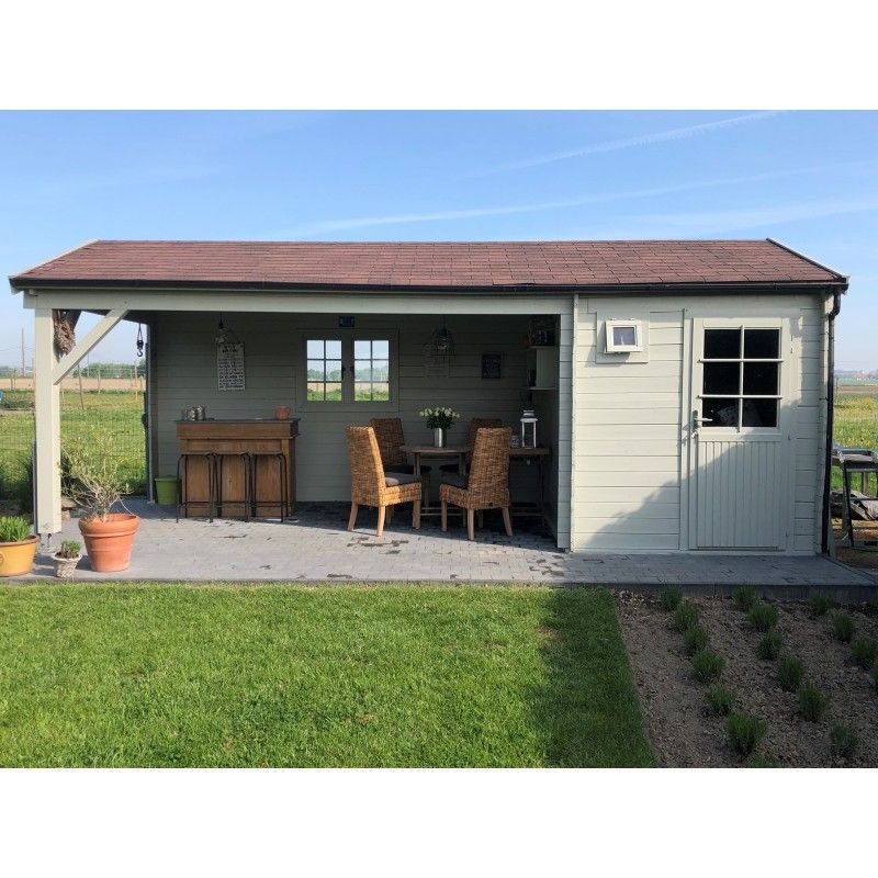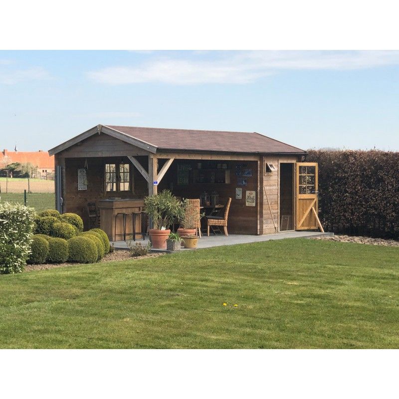 Abri de jardin avec lounge. Ce modèle est la sale extérieure idéale pour faire des barbecues et des dîners à l'extérieur. Fabriqué en bois d'épicéa d'Europe du Nord de haute qualité. Certifié PEFC et toujours livré avec un certificat d'authenticité.