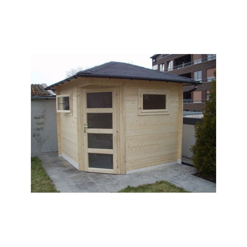 Abri de jardin simple et traditionnel avec toit pyramidal. Idéal pour y créer un grand espace de stockage. Nous utilisons ici le sapin blanc du Nord.