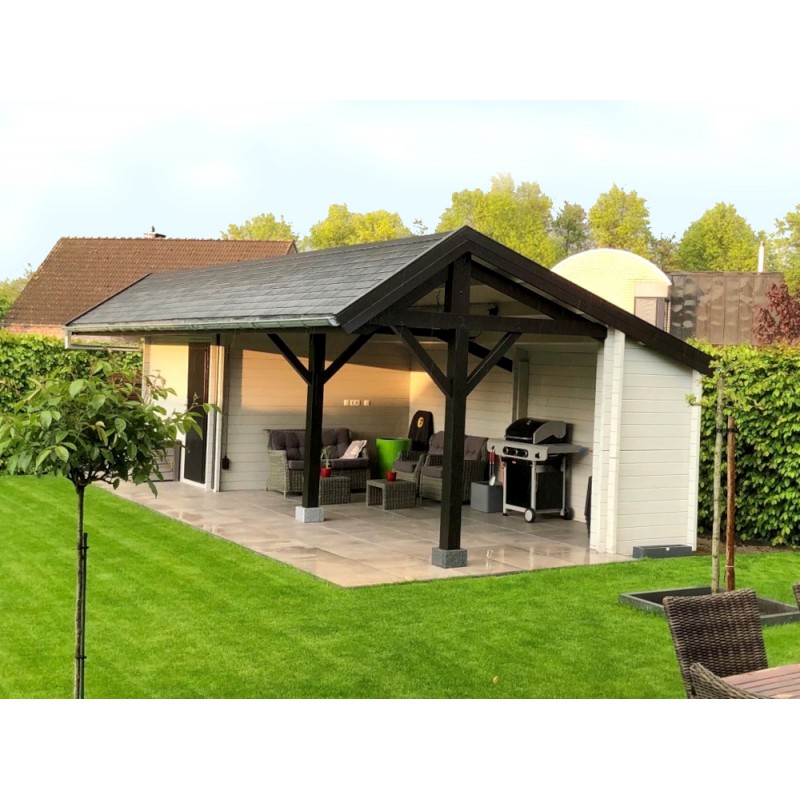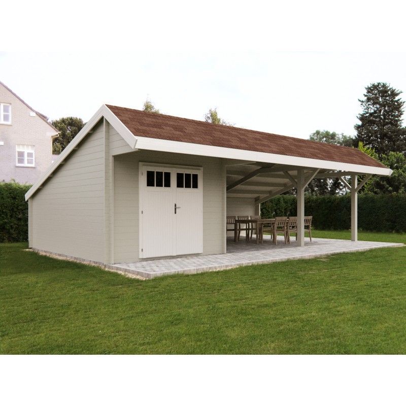 Abri Contemporain, distinqué et raffiné, exécuté avec du pin de qualité provenant d'Europe du Nord, également certifiés PEFC et toujours livré avec un certificat d'origine. La toiture de Cet abri de jardin est constituée avec des bardeaux d'asphalte disponible dans un choix de couleurs.